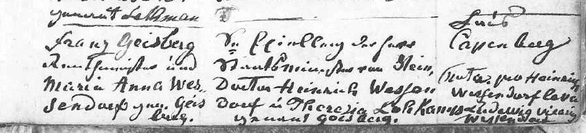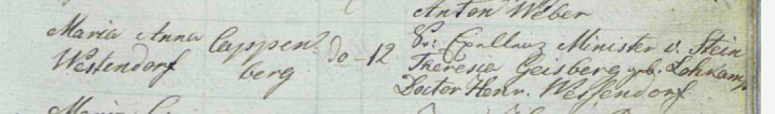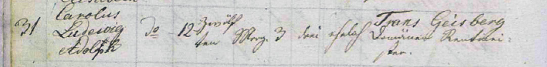 [1] Eintragungen im Taufregister St. Johannes Evangelist in Cappenberg: 12.09.1817 Carolus Ludowikus Adolphus („Charles”) Geisberg; – 03.03.1819 Franciska Adolphina Antonia Elisabeth Geisberg; – 27.03.1820 Casparus Ludowicus Petrus Antonius Geisberg.