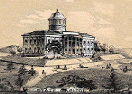 Im August 1821 bekam Missouri die „Admission as a State” der Vereinigten Staaten und 1826 wurde Jefferson City Sitz der Legislative und Exekutive. In dem Ort lebten gerade einmal 31 Familien, es gab nur ein Hotel und einen „General Store“, aber Jefferson bot für das zu errichtende Capitol einen Bauplatz mit dem besten Blick über den Missouri-Fluss weit und breit. Wenn die „General Assembly“ des Staates Missouri zusammentrat, hatte Jefferson City Saison. In den Sitzungswochen waren Herbergen und Gasthäuser gut beschäftigt und auch die „Stores“ profitierten von den anreisenden Delegierten. So auch über die Jahreswende 1842/43 hinweg, als Charles Geisberg in der Stadt lebte. Doch im Frühling reisten die „Legislators“[25] ab und es wurde in Jefferson recht still. Bei Charles‘ Arbeitgeber, der vier Brüder im Geschäft hatte, gab es nicht genug Beschäftigung, schon gar nicht für den „Praktikanten“.[26]