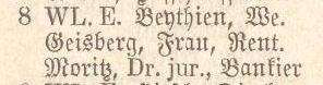 Das Adressbuch von Weimar (1884)(7) bestätigt die Angabe. Frau M. Geisberg wohnte zu der Zeit in der Belvederer Allee 8. Das Haus gehörte vermutlich dem Bankier Dr. Moritz. Ein Anwesen in hervorragender Lage mit Blick über den Fluss auf das gegenüberliegende Ufer, wo u.a. Goethes Gartenhaus zu finden ist.