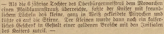 Dorothea Kayser lässt nicht unerwähnt, was ihr als Fünfjährige unangenehm war. Sie erinnert sich an die „Nachwehen“ der Begegnung: Bei jedem Besuch von Herrschaften mußte ich mich im „Kaiserkleid“ mit der Brosche „präsentieren“. Es war schrecklich. Als der Regierungspräsident von Oppeln bei uns war und ich wieder vorgezeigt wurde, nahm er mich hoch und küßte mich auf die Stirn. „Da, wo Dich mein Kaiser hingeküßt hat, muß ich es auch tun!“ Schrecklich!