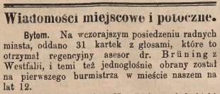Zwei Monate später verriet die "Gazeta Górnoszląska" (Oberschlesische Zeitung), dass in der Stadt zu hören sei, Herr Assessor Brüning aus Westfalen werde Bürgermeister. Das Gerücht bewahrheitete sich. In der Ausgabe vom 22. November meldete die "Gazeta", dass der Regierungsassessor Dr. Brüning alle 31 Stimmen des Gemeinderates auf sich vereinigen konnte und damit auf zwölf Jahre zum Ersten Bürgermeister der Stadt Bytom (Beuthen) gewählt wurde.(11) Am selben Tag notierte auch der deutschsprachige "Oberschlesische Wanderer", dass Assessor Dr. Brüning in Warburg (Westphalen) am 20. November in der um 4 Uhr abgehaltenen Stadtverordneten-Sitzung... 31 Stimmen erhielt und mithin... einstimmig zum ersten Bürgermeister gewählt sei.(12)