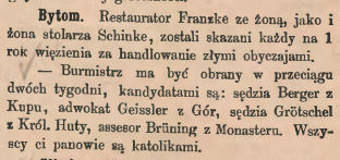 Die in Królewska Huta (Königshütte O.S./ Chorzów) veröffentlichte polnische Zeitung "Katolik" berichtete am 19. September 1882 von der in Kürze in der Stadt Beuthen stattfindenden Bürgermeisterwahl und nannte als Kandidaten Richter Berger aus Kupp (Kup), Rechtsanwalt Geissler aus Góry, Richter Grötschel aus Königshütte (Królewska Huta) und Assessor Brüning aus Münster mit dem Hinweis, dass alle diese Herren Katholiken seien.(10)