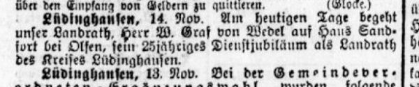 Unserem Mitbürger, dem Königlichen Landrath Herrn Graf von Wedel, soll von den Eingesessenen des Amtes Olfen aus Anlaß seines 25 jährigen Dienstjubiläums am Mittwoch den 14. November diese Jahres Abends gegen 7 Uhr auf Haus Sandfort ein Fackelzug mit Musik und Gesang dargebracht werden.