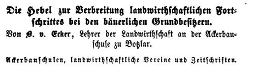 Ecker blieb bis 1862 Lehrer der Landwirtschaft an der Ackerbauschule Botzlar und veröffentlichte im Jahr seines Abschieds einen bemerkenswerten Aufsatz in den vom Präsidium des Landes-Ökonomie-Kollegiums Berlin herausgegebenen „Annalen der Landwirthschaft“(6):